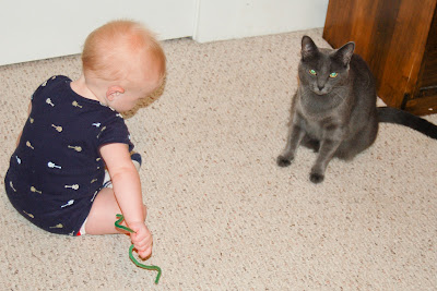 This is one of my favorite moments from August. Miles was unwittingly playing quite well with Satine. He'd pick up a pipe cleaner (read: kitty toy), wave it around, throw it on the ground, and then watch in wonder as Satine would bat it back to him. Lather, rinse, repeat. It was adorable!